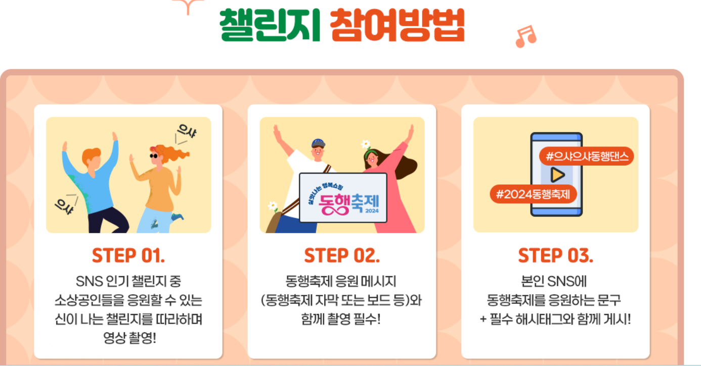 동행댄스 챌린지는 모든 국민이 참여할 수 있는 즐거운 이벤트 행사로, 챌린지는 소상공인을 응원하고, 우리 경제에 활력을 불어넣기 위해 마련되었습니다. 참여 방법은 매우 간단하며, 다음의 단계를 따르시면 됩니다.